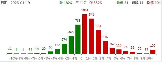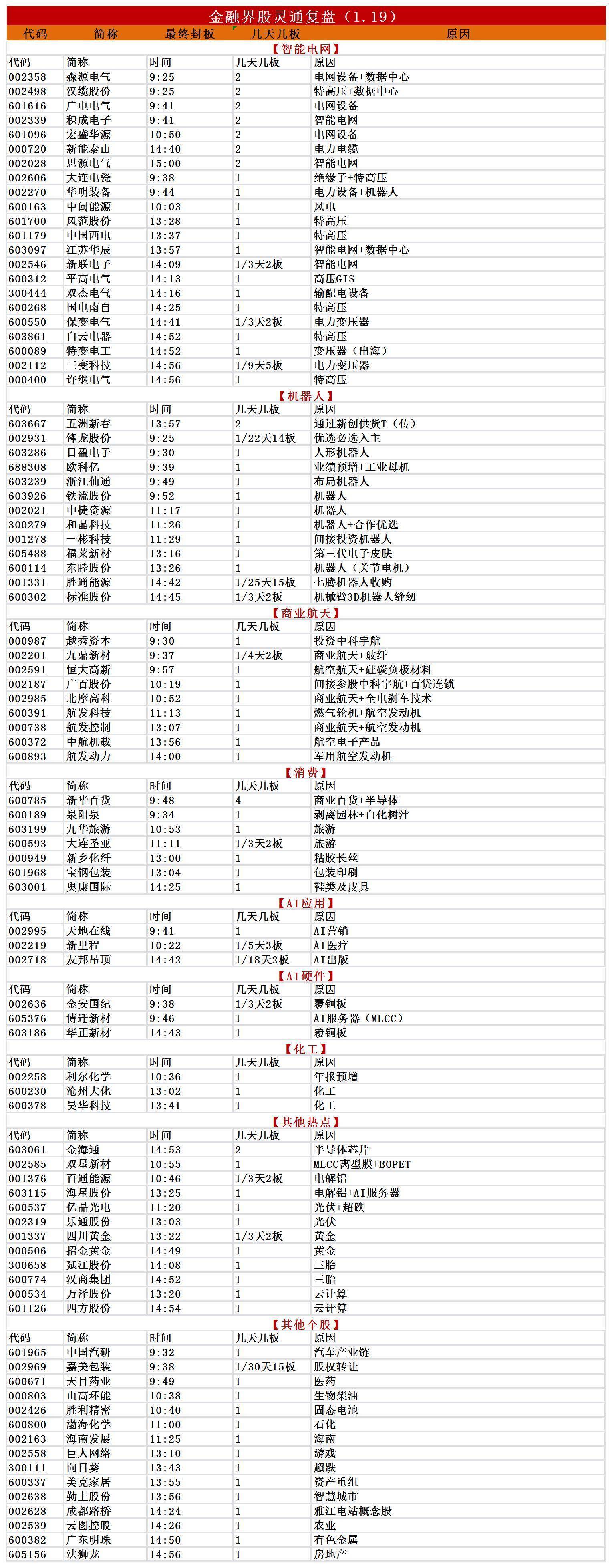 1月19日,三大指数涨跌不一,沪指走势较强,创业板指冲高回落。沪深两市成交额2.71万亿,较上一个往复日缩量3179亿。盘面上,全阛阓超3500只个股高涨,共103只股涨停。从板块来看,电网开导主意爆发,十余只因素股涨停,保变电气、中国西电、广电电气涨停。机器东谈主主意震憾拉升,五洲新春、日盈电子涨停。贵金属板块涨幅居前,四川黄金、招金黄金涨停。旅游栈房主意走强,大连圣亚、九华旅游涨停。贸易航天主意局部活跃,九更动材、越秀成本涨停,澳门赌城app超捷股份涨超15%。下降方面,CPO主意震憾下挫,剑桥科技跌停,腾景科技、光迅科技下挫。