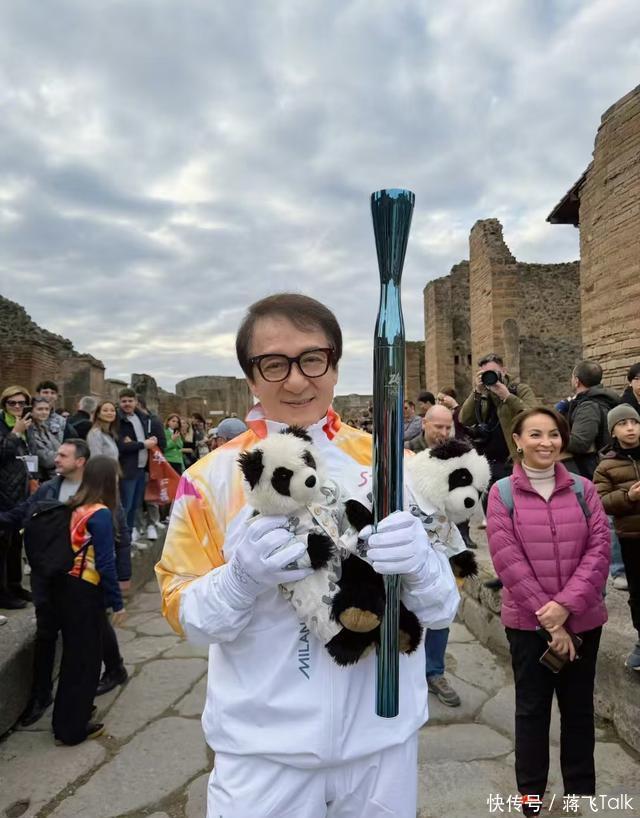 在庞贝火把传递的成龙老大,穿伶仃白色引导服,抱着大熊猫玩偶与火把合影,期间齐不忘发扬中国文化。