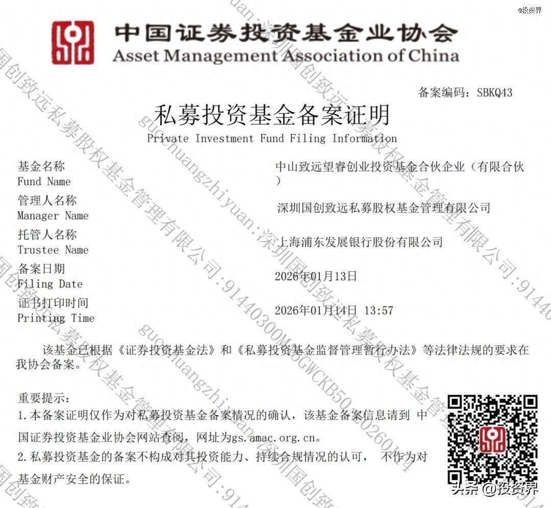 投资界(ID:pedaily2012)1月19日讯息,近日,由中山国度健康科技产业基地参股的中山致远眺睿创业投资基金合资企业(有限合资)(简称“国创中山基金”)追究培植并完成中国证券投资基金业协会备案。国创中山基金的处理东说念主为深圳国创致远私募股权基金处理有限公司,该基金将以医疗器械为主要投资标的,发奋于于发掘和培育具备革命后劲与高成长性的优质企业,通过精确投资与专科赋能,澳门信誉网赌城激动革命本领落地和产业升级,为健康产业高质料发展注入动能。