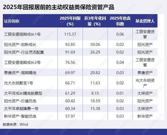 2025年收益率最高的职权类保障资管家具“工银安盛周期成长1号”齐备翻倍收益,2025年收益率达115.37%。“阳光钞票-立异成长”以92.85%的收益率排第二,“阳光钞票-行业机动设置”以91.69%排第三。