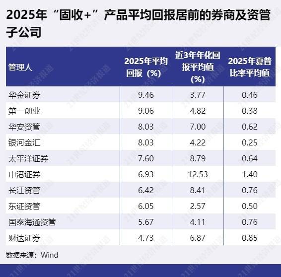 2025年“固收+”家具平均收益率最高的是华金证券,2025年“固收+”家具平均报恩为9.46%。第一创业平均报恩也跨越9%,达9.06%,华安资管以8.03%排第三。