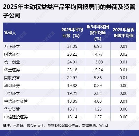 2025年主动职权类鸠集欢跃家具平均报恩名次靠后的券商及资管子公司包括万联资管、华龙证券、大同证券等。